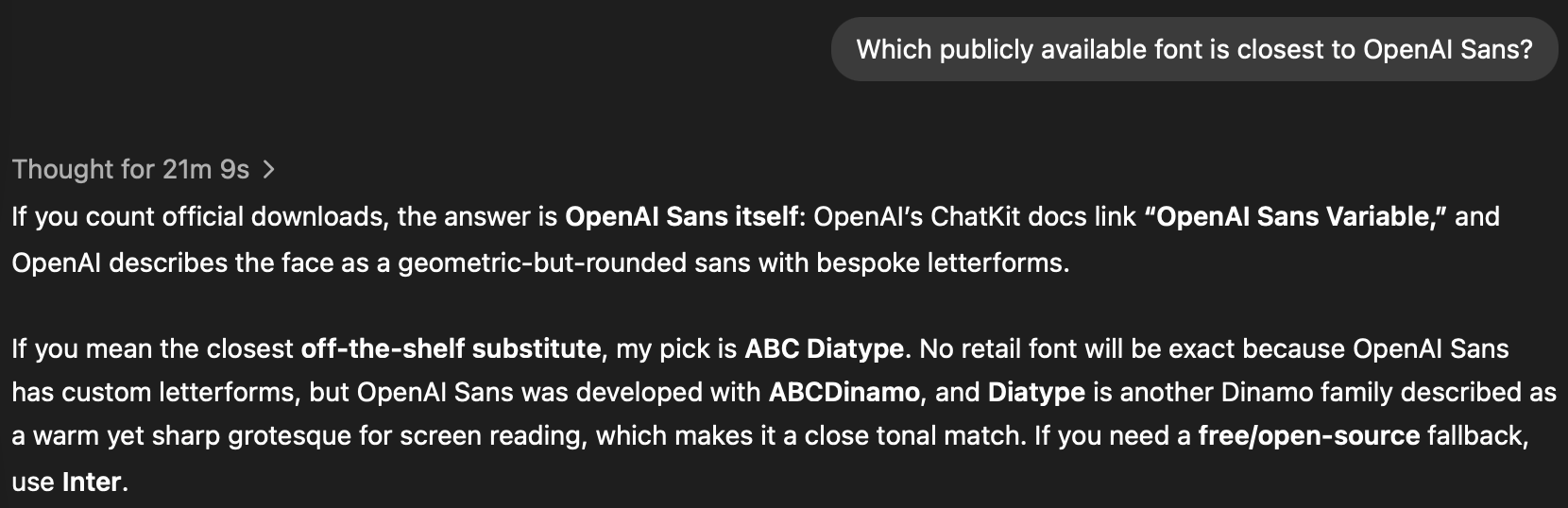 So we asked ChatGPT what the most similar publicly available alternative font to OpenAI Sans would be and it pointed us to ABC Diatype, made by the same design shop that created OpenAI Sans.