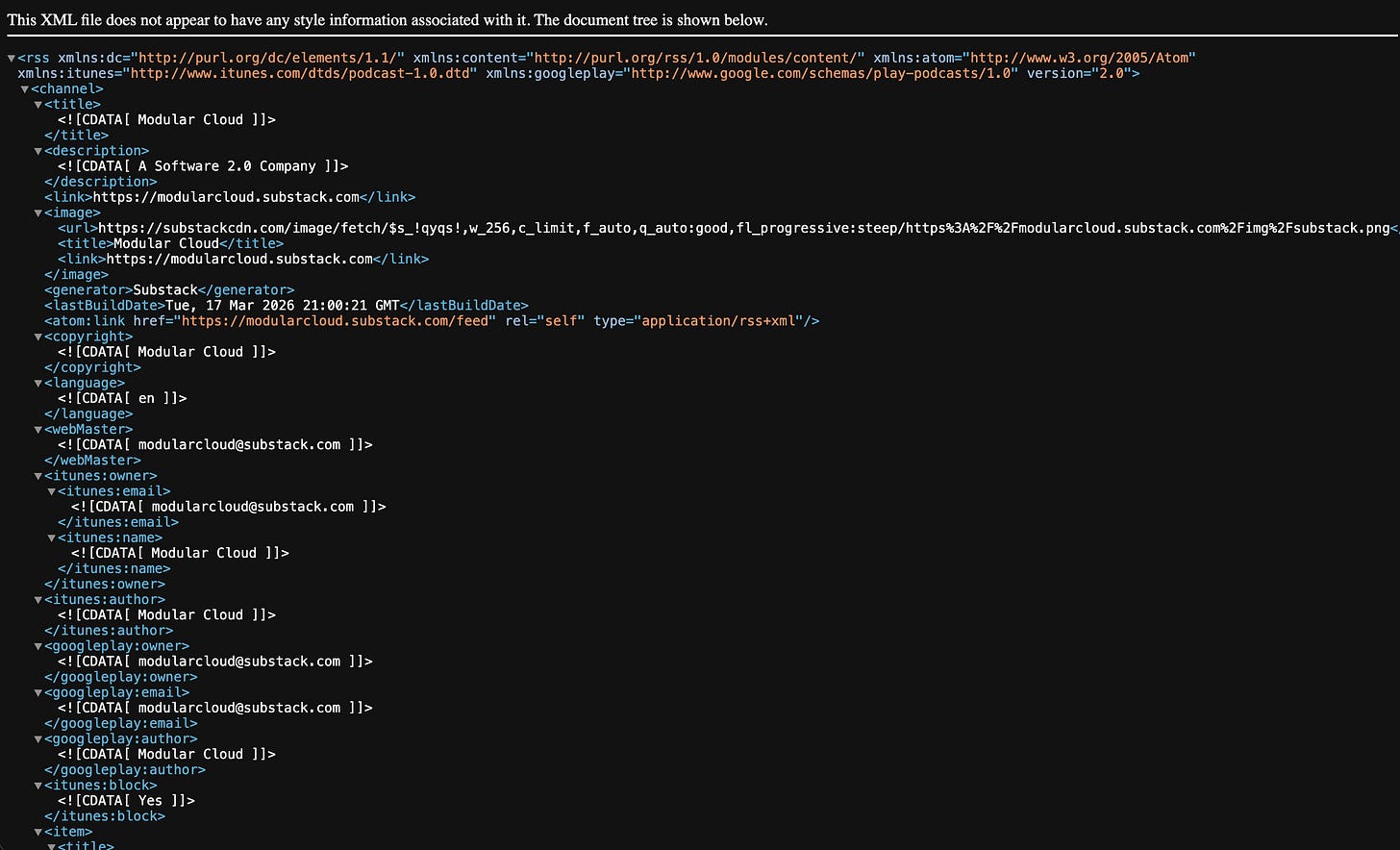 I want to use substack as the backend for the blog. At build time, fetch the RSS feed from https://modularcloud.substack.com/feed and populate posts with the content from this. To be clear, I want the nextjs site to be statically generated from this content source