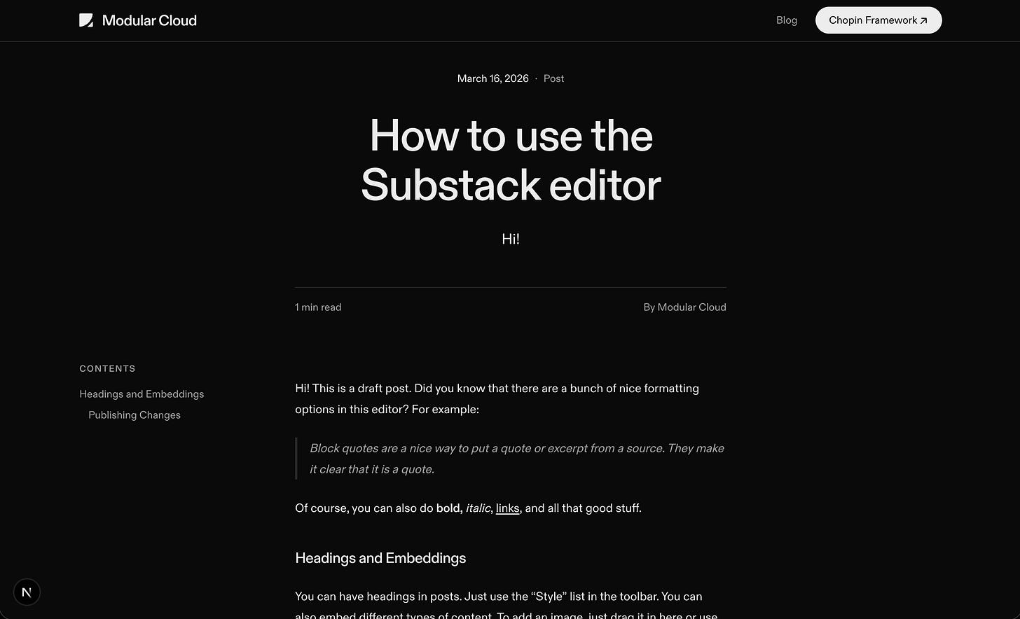 But not quite. Substack also doesn’t support programmatic subscriptions, so we are maintaining a separate mailing list using Resend for those that subscribe on modular.cloud. We could link people to Substack to subscribe, but thought it would be a better UX for them to be able to subscribe without leaving the page.