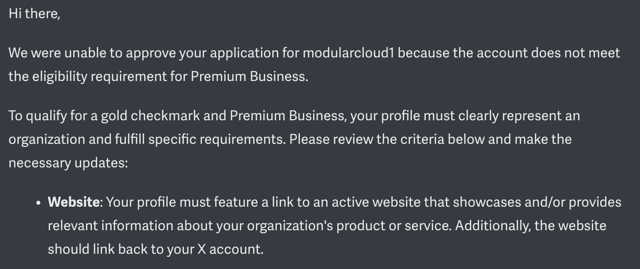 After our company went through a substantial pivot, we started to revamp our social media presence. We were once a verified business on X, and wanted to get reverified after allowing that expensive subscription to lapse. But when we re-applied, we were rejected.