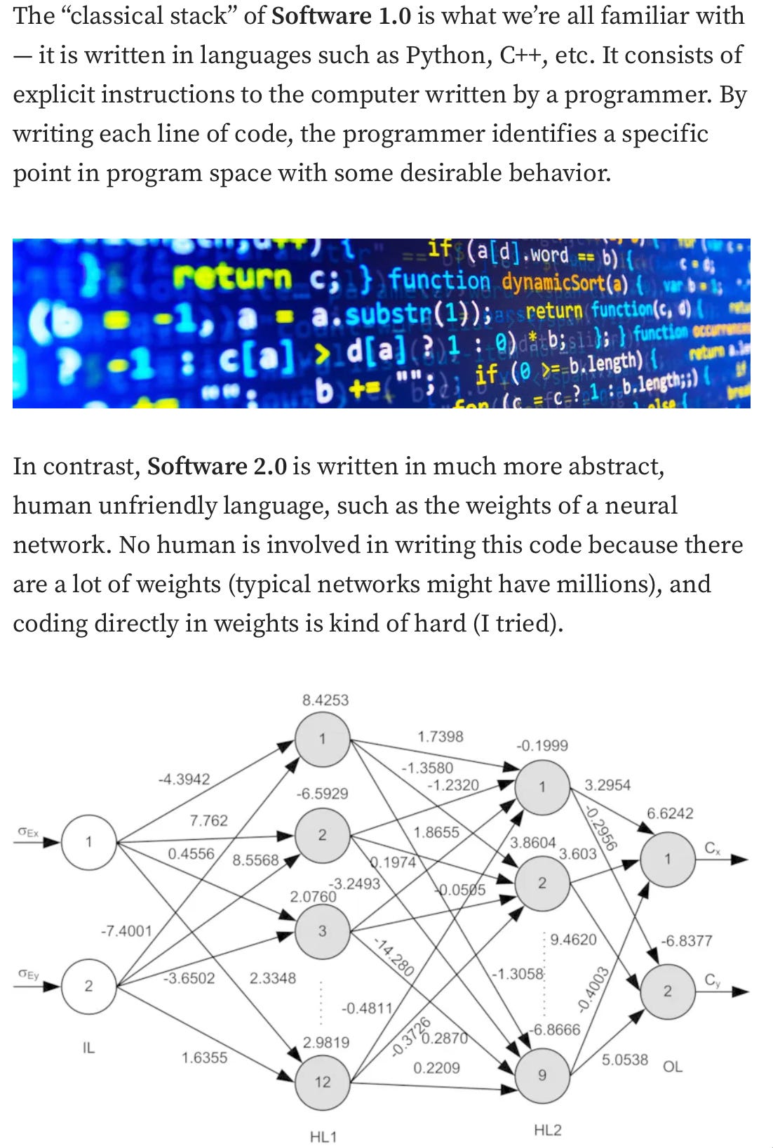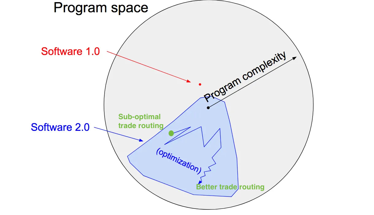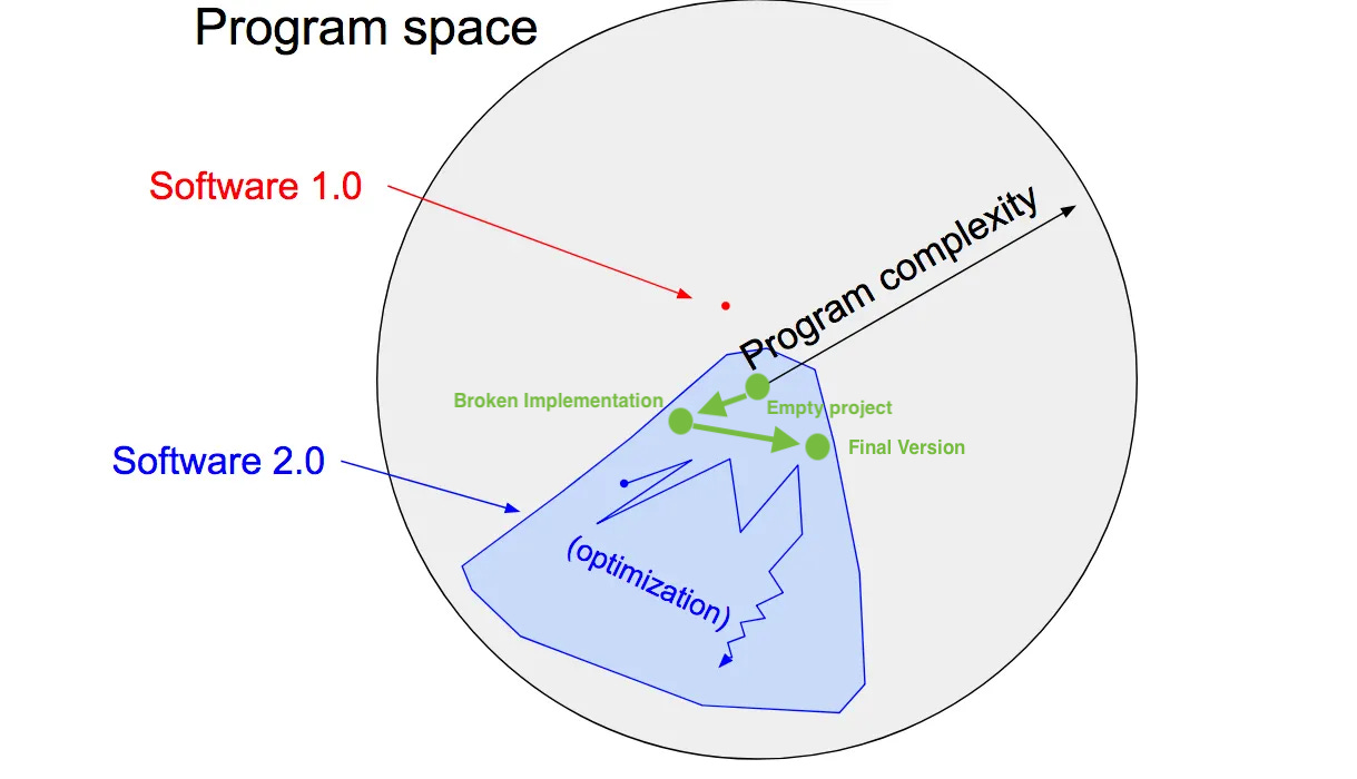The idea that Karpathy put forth was ingenious. He first drew a comparison between traditional software (Software 1.0) and Software 2.0. Software 1.0 is written by hand, whereas Software 2.0 is discovered by an automated process that could create much more complex and powerful software than human could ever write.