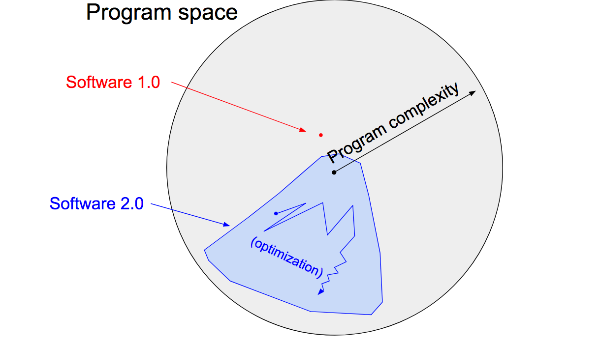 In the space of all possible programs (depicted in the circle above), the Software 2.0 process systematically finds the point in that program space has the developer’s desired behavior. When constructing Software 2.0, you are not contributing to that implementation directly, but rather architecting an automated search process that discovers a working implementation.